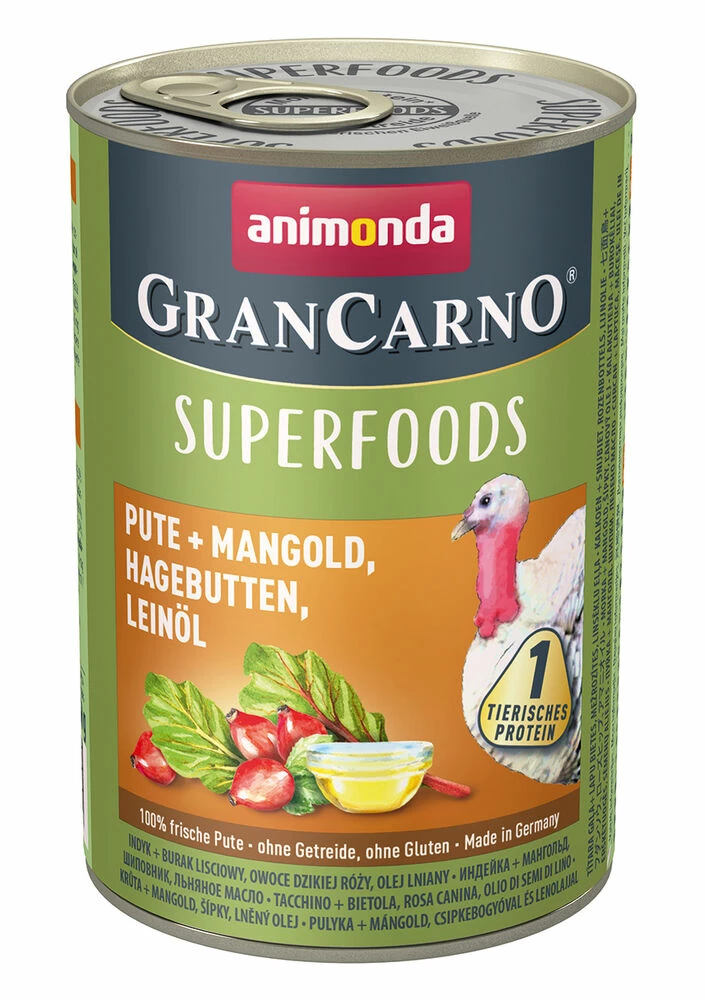 GranCarno Superfoods Pute + Mangold, Hagebutten, Leinöl versorgt Hunde von 1 bis 6 Jahren mit allen lebenswichtigen Nährstoffen. Das Feuchtfutter für ausgewachsene Hunde vereint 100 % frische, fleischliche Zutaten von der Pute mit natürlichen, regionalen Superfoods – so, wie Fellnasen es lieben!
