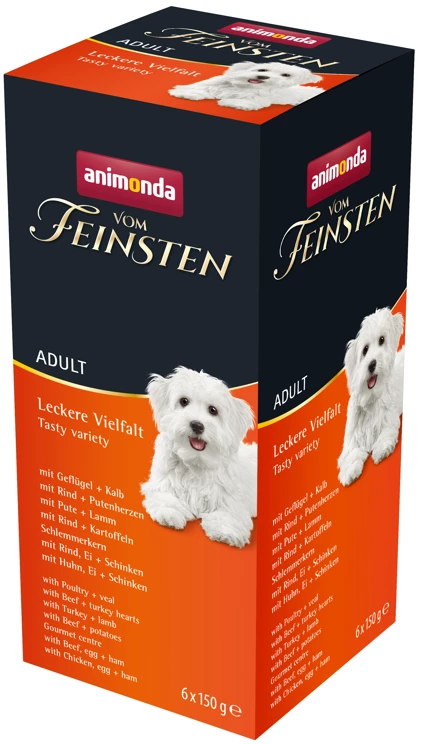 Vom Feinsten Adult steht für ausgewogene, leckere gesunde Ernährung auf höchstem Niveau für ausgewachsende Hunde von 1 – 6 Jahren. Die besondere Auswahl und Qualität der fleischlichen Zutaten garantieren einen einzigartigen Genuss. Die fein-stückigen Pasteten versorgen den ausgewachsenen Hund mit allen lebenswichtigen Nährstoffen.