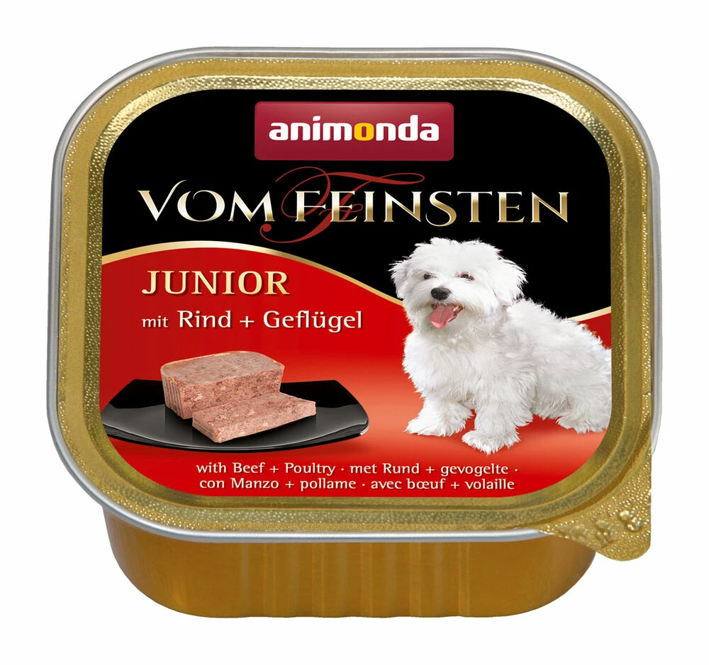 Auf die besonderen Ernährungsbedürfnisse von Welpen und jungen Hunden ist animonda Vom Feinsten Junior abgestimmt. Die Herstellung erfolgt pur aus fleischigen Rohstoffen, ohne Getreide, Soja, Zucker, künstlichen Farb- und Konservierungsstoffen. Für Abwechslung sorgen drei Varietäten. Die praktischen Schalen sind leicht zu öffnen und die Portionen sind optimal für junge Hunde.