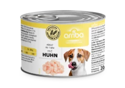 Mit arriba natürlich gut in Form. 71 % Fleisch sowie Innereien, stets schonend verarbeitet, sorgen für eine besondere Akzeptanz und Bekömmlichkeit. Mind. 30% mit leckerem Huhn. Distelöl mit seinem hohen Gehalt an ungesättigten Fettsäuren kann den Zellschutz und die körpereigenen Abwehrkräfte unterstützen. Getreidefreies Nassfutter für Hunde in der kleinen 200g Dose. Ideal zum Testen oder für kleinere Hunderassen.