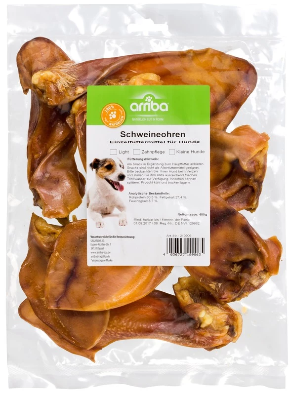 arriba Schweineohren wurden schonend verarbeitet und getrocknet, unterstützen die natürliche Zahnreinigung und sorgen für Beschäftigung und Kauvergnügen.