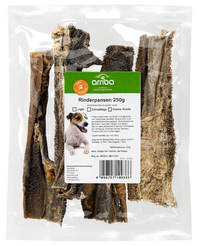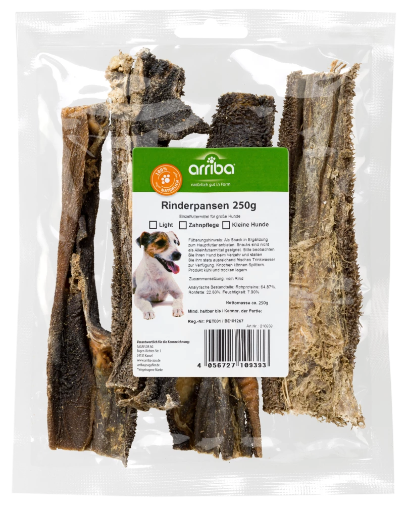 Einzelfuttermittel für Hunde. Pansen sorgt für die natürliche Darmaktivierung. Hundesnack aus leckerem Rinderpansen in der 250g Tüte.