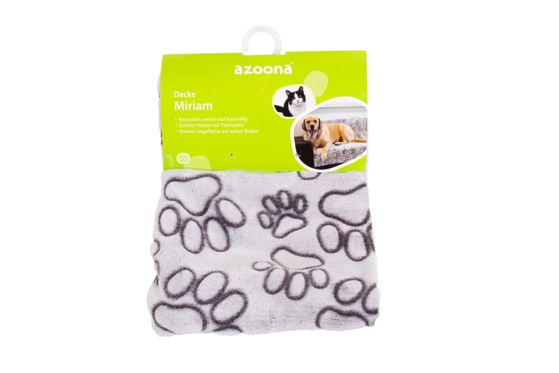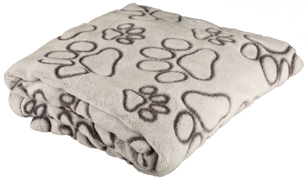Hundedecke Miriam in hellgrau mit dunkelgrauem Pfotenmotiv. Die Decke ist weich und kuschelig, schützt Ihr Polster vor Tierhaaren und bietet eine warme Liegefläche auf kalten Böden für Ihren Liebling.