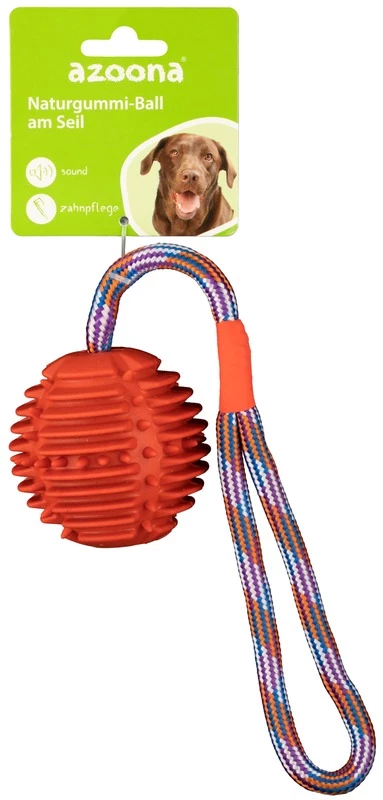 Hundespielzeug Ball am Seil aus Naturgummi. Das Hundespielzeug hat für jeden Spieltypen etwas zu bieten. Das Spielzeug pflegt spielerisch die Zähne Ihres Hundes
