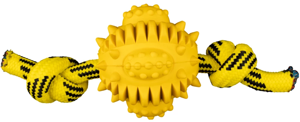 Hundespielzeug Rugby am Seil aus Naturgummi. Das Hundespielzeug hat für jeden Spieltypen etwas zu bieten. Das Spielzeug pflegt spielerisch die Zähne Ihres Hundes.