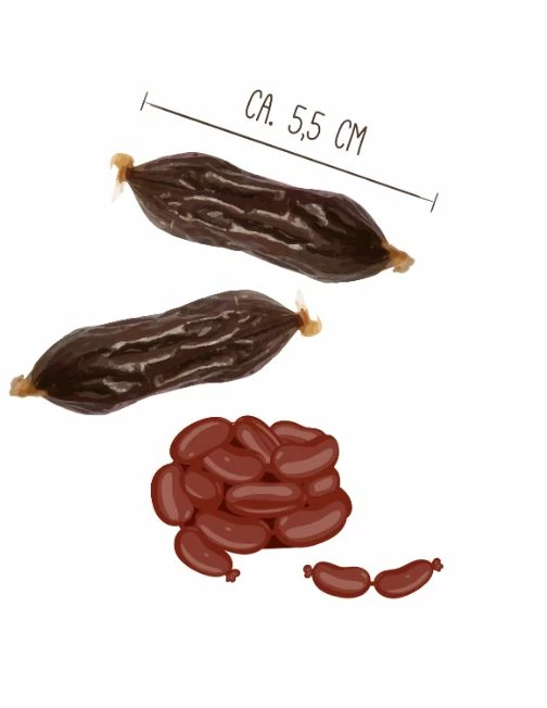 Saftige Stücke vom Wasserbüffel werden frisch und behutsam zu kleinen Würstchen verarbeitet. Die anschließende Trocknung an der Luft schließt die im Snack enthaltenen wertvollen Nährstoffe besonders gut ein. Garantiert ohne Aromastoffe, Zucker- oder Getreidezusatz.