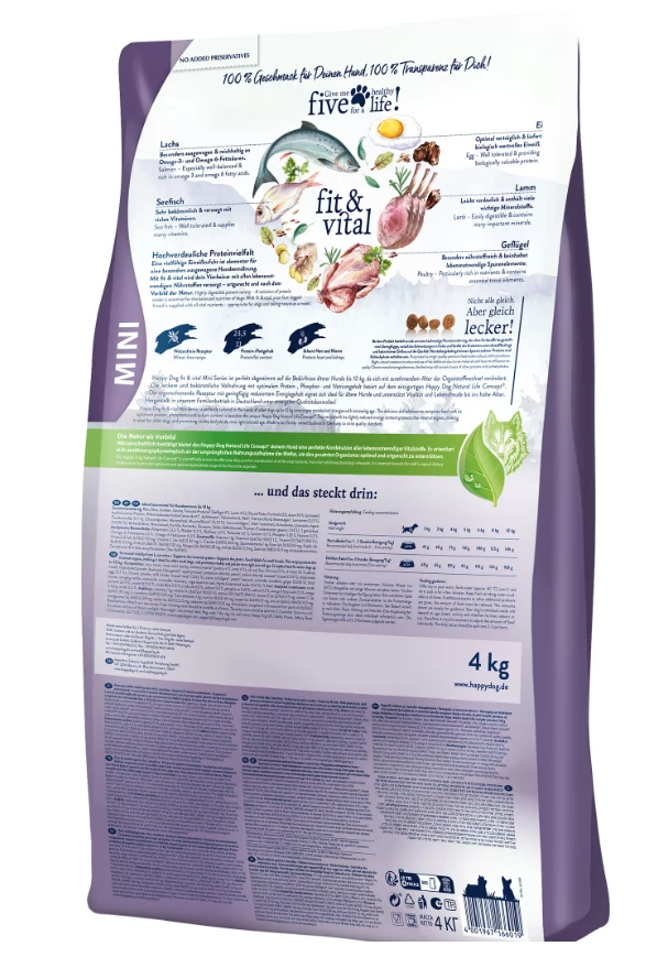 Das Futter für deinen älteren Vierbeiner sollte naturnah und ausgewogen mit der Extraportion Gesundheit sein? Dann ist Happy Dog fit & vital Mini Senior das passende Trockenfutter für dich. Nach dem Vorbild der Natur sorgen fünf verschiedene Eiweißkomponenten aus Lachs, Seefisch, Ei, Lamm und Geflügel für eine gesunde Proteinvielfalt.