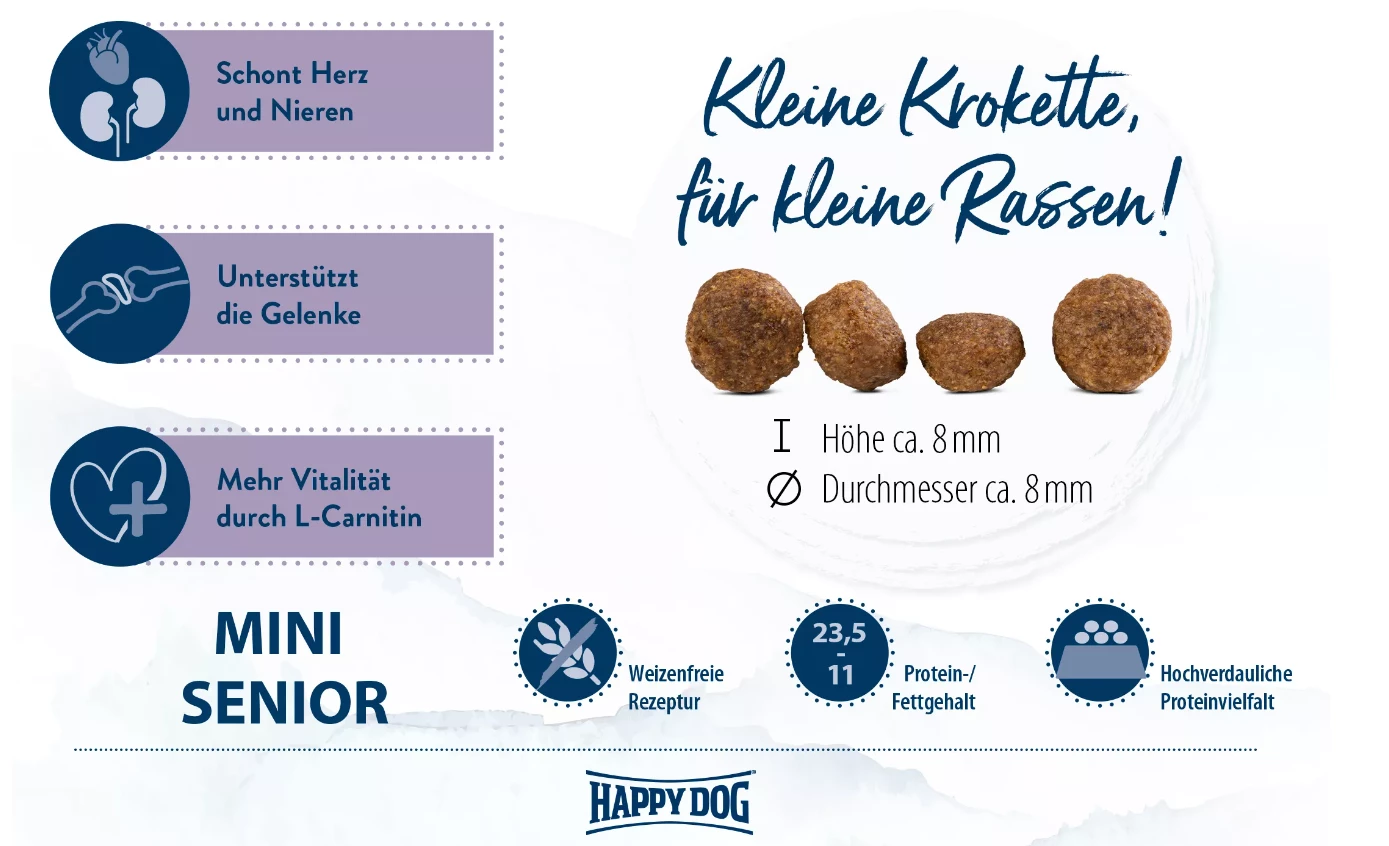 Happy Dog fit & vital Mini Senior ist ideal abgestimmt auf die Bedürfnisse älterer Hunde, da sich mit zunehmendem Alter der Organstoffwechsel verändert. Das leckere und bekömmliche Futter für Senior-Hunde mit optimalem Protein-, Phosphor- und Natriumgehalt schont die Organe. Vor allem Herz und Nieren werden entlastet. Die weizenfreie Rezeptur ist zudem mit vitalisierendem L-Carnitin angereichert und sorgt durch die beigefügte Neuseeland-Muschel für mehr Bewegungsfreude. Vitamin C unterstützt außerdem die körpereigenen Abwehrkräfte. So sind Vitalität und Lebensfreude bis ins hohe Hunde-Alter möglich und du kannst mit deinem Vierbeiner noch viele schöne Momente verbringen.