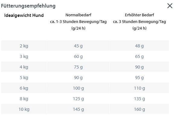 Rohprotein 23,5 %, Rohfett 11,0 %, Rohfaser 2,0 %, Rohasche 6,0 %, Calcium 0,9 %, Phosphor 0,65 %, Natrium 0,3 %, Omega-6-Fettsäuren 2,5 %, Omega-3-Fettsäuren 0,3 %