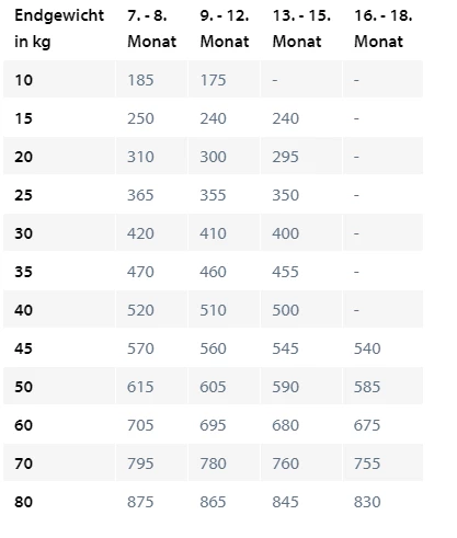 Hinweis: Mit zunehmendem Erreichen des Endgewichtes nimmt der Energiebedarf ab und die Futtermenge muss entsprechend der Fütterungsempfehlung angepasst werden.