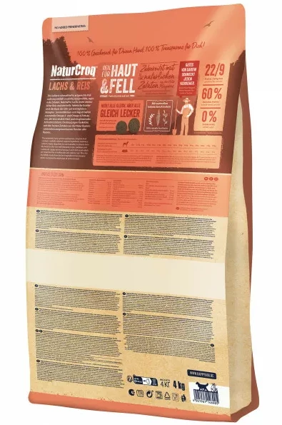 Dein Hund hat immer wieder Probleme mit seiner Haut und seinem Fell? Dann kann ihn Happy Dog NaturCroq Lachs & Reis, die ausgewogene und bekömmliche Vollnahrung mit den besten Zutaten aus der Natur Bayerns unterstützen. Die knusprigen Kroketten enthalten hochwertige Zutaten wie nahrhaften Lachs, sehr gut verträglichen Reis und gesundes Vollkorngetreide aus der Region. Lachs ist reich an essenziellen Omega-3- und Omega-6- Fettsäuren, die für eine intakte Haut und ein glänzendes Fell sorgen.