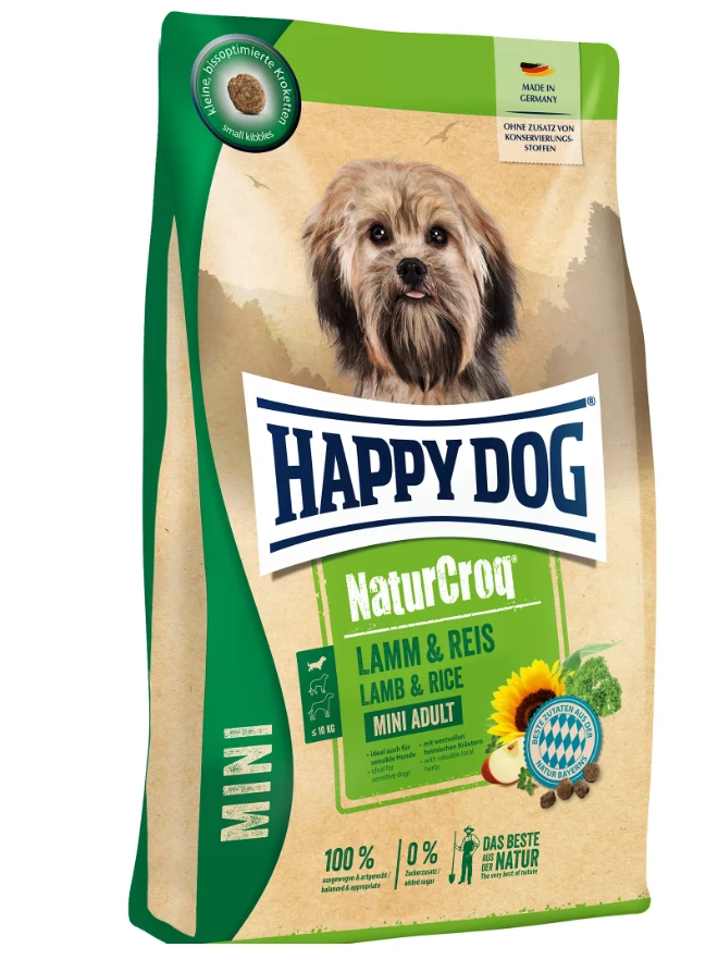 Probleme mit der Verdauung treten bei Hunden relativ häufig auf. Gehört dein kleiner Hund zu den Vierbeinern mit einem sensiblen Magen? Dann solltest du ein Futter für ihn auswählen, welches eine hohe Verdaulichkeit hat und sich für verdauungssensible Hunde eignet. Dazu zählt unser Happy Dog NaturCroq Mini Lamm & Reis. Beste Inhaltsstoffe aus leicht verdaulichem Lamm und magenschonendem Reis verwöhnen deinen kleinen Hund, ohne ihn zu belasten. Getrocknete Kräuter aus Bayern komplettieren die zu 100% ausgewogene und artgerechte Hundefutter-Rezeptur.