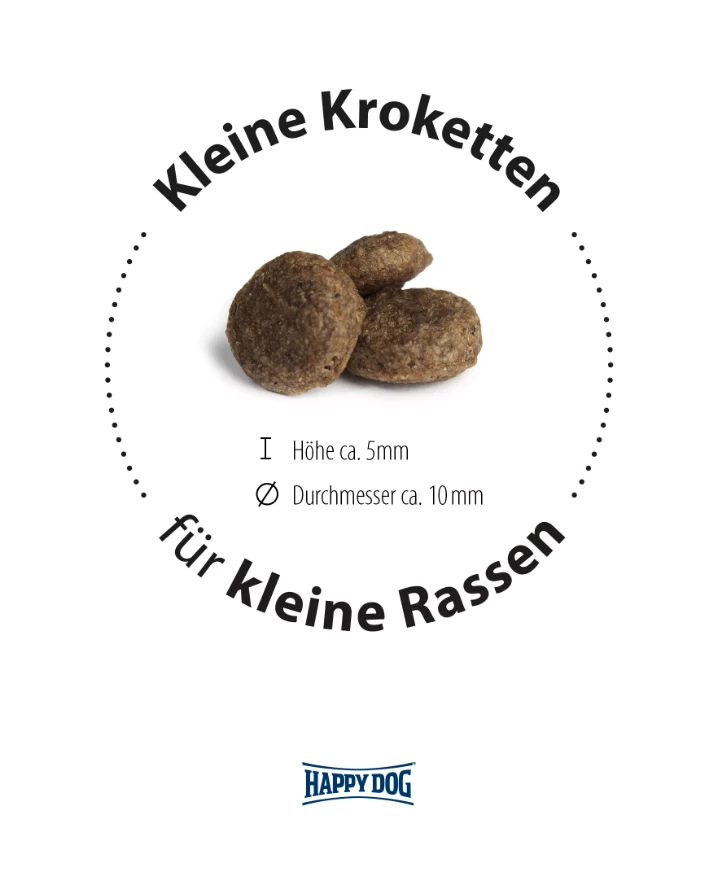 Die extra kleinen Kroketten sind optimal auf das Gebiss kleiner Hunderassen bis 10 kg abgestimmt.