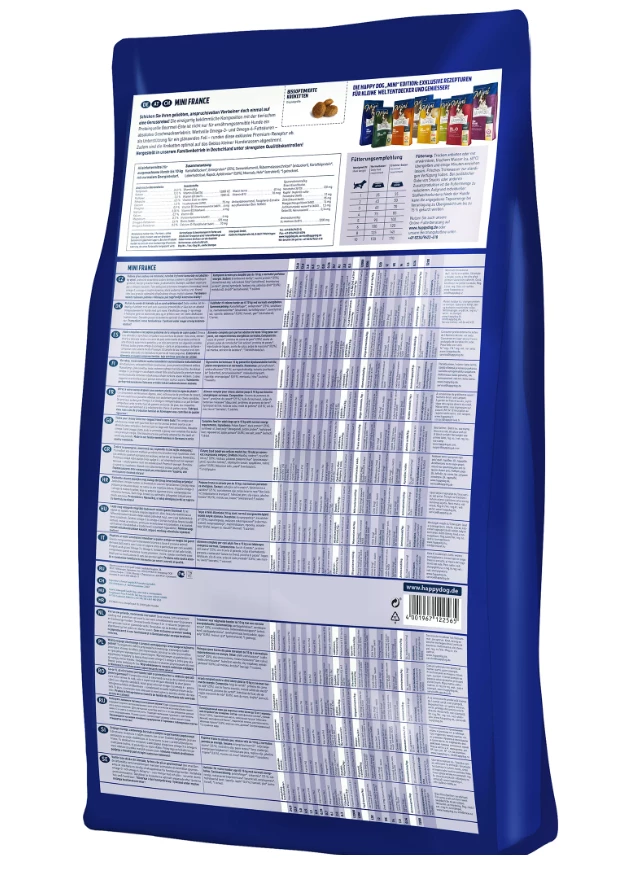 Du möchtest deinen Vierbeiner mit einem besonderen Futter verwöhnen? Oder hast eine sensible Fellnase zu Hause, die zu Verdauungsproblemen neigt? Feine Gourmet-Ente als einzige tierische Proteinquelle und glutenfreie Kartoffel begeistern selbst die sensibelsten Feinschmecker. Kartoffeln enthalten kein Gluten und sind somit für Tiere mit Getreideunverträglichkeiten zu empfehlen. Ente als seltene und exklusive Proteinquelle zeichnet sich durch eine optimale Verträglichkeit aus. Wertvolle Omega-3 und Omega-6 Fettsäuren – wichtig für eine gesunde Haut und ein glänzendes Fell – runden die exklusive Rezeptur ab. Dies macht Mini France zu einem ausgewogenen und idealen Trockenfutter für Hunde mit Allergien und Futtermittelunverträglichkeiten. Die außergewöhnlich schmackhafte Super-Premium-Vollnahrung Happy Dog Mini France ist zudem ideal für alle anspruchsvollen, ausgewachsenen Feinschmecker bis 10 kg, die Abwechslung suchen oder sehr wählerisch sind. Die extra kleinen Kroketten sind optimal auf das Gebiss kleiner Hunderassen abgestimmt.