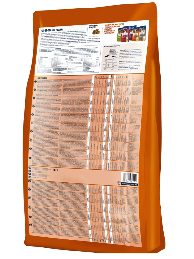 Die Mittelmeerküche ist schon seit jeher für ihre leichten und schmackhaften Gerichte bekannt. Mit Happy Dog Mini Toscana verwöhnst du deine Fellnase mit einem besonders ausgewogenen Arrangement aus feiner Ente, fettarmem Seefisch und mediterranen Kräutern. Abgerundet wird die exklusive Rezeptur basierend auf dem einzigartigen Happy Dog Natural Life Concept® durch wertvolle Neuseeland-Muschel für die Gelenke. Aufgrund dieser speziellen Komponenten und des besonderen Herstellungsverfahrens ist Happy Dog Mini Toscana sehr gut geeignet für eine bewusste Ernährung gerade auch von sensiblen Hunden mit ihren speziellen Bedürfnissen. Durch den moderaten Fettgehalt von 7,5% eignet sich Happy Dog Mini Toscana hervorragend auch für kastrierte Hunde und Hunde, die eine fettreduzierte Nahrung benötigen. Die kleinen Kroketten sind perfekt auf das Gebiss kleiner Hunderassen bis 10 kg abgestimmt.