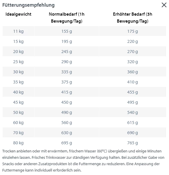 Rohprotein 25,0 %, Rohfett 14,0 %, Rohfaser 3,5 %, Rohasche 8,0 %, Calcium 1,55 %, Phosphor 1,0 %, Natrium 0,35 %, Kalium 0,85 %, Magnesium 0,1 %, Omega-6-Fettsäuren 3,0 %, Omega-3-Fettsäuren 0,3 %