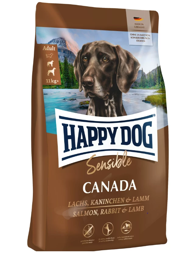 Die getreidefreie und schmackhafte Rezeptur von Happy Dog Canada mit einem leicht erhöhten Energiegehalt eignet sich ideal für ausgewachsene, aktive Vierbeiner ab 11 kg.