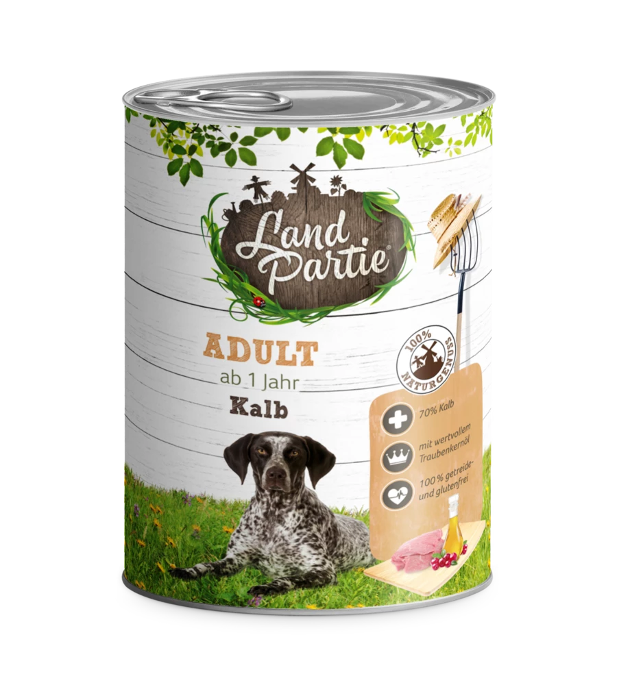 Frei von Getreide und Gluten formuliert ist dieses LandPartie Nassfutter auch für ernährungssensible Hunde besonders gut bekömmlich
