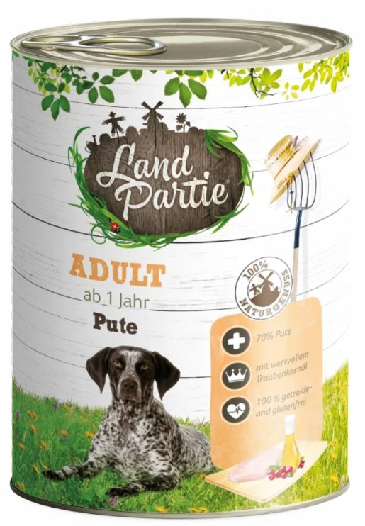 Frei von Getreide und Gluten formuliert ist dieses LandPartie Nassfutter auch für ernährungssensible Hunde besonders gut bekömmlich.