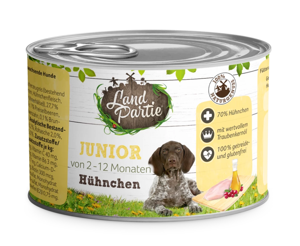 Frei von Getreide und Gluten formuliert ist dieses LandPartie Nassfutter auch für ernährungssensible Hunde besonders gut bekömmlich