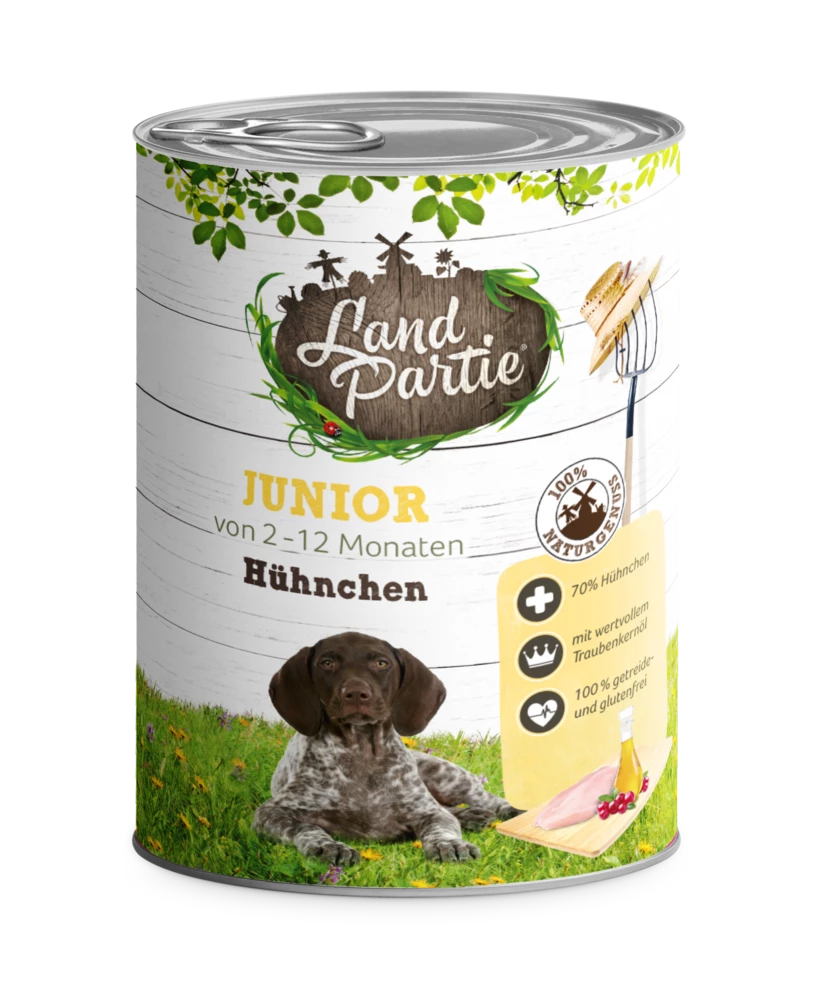 Frei von Getreide und Gluten formuliert ist dieses LandPartie Nassfutter auch für ernährungssensible Hunde besonders gut bekömmlich