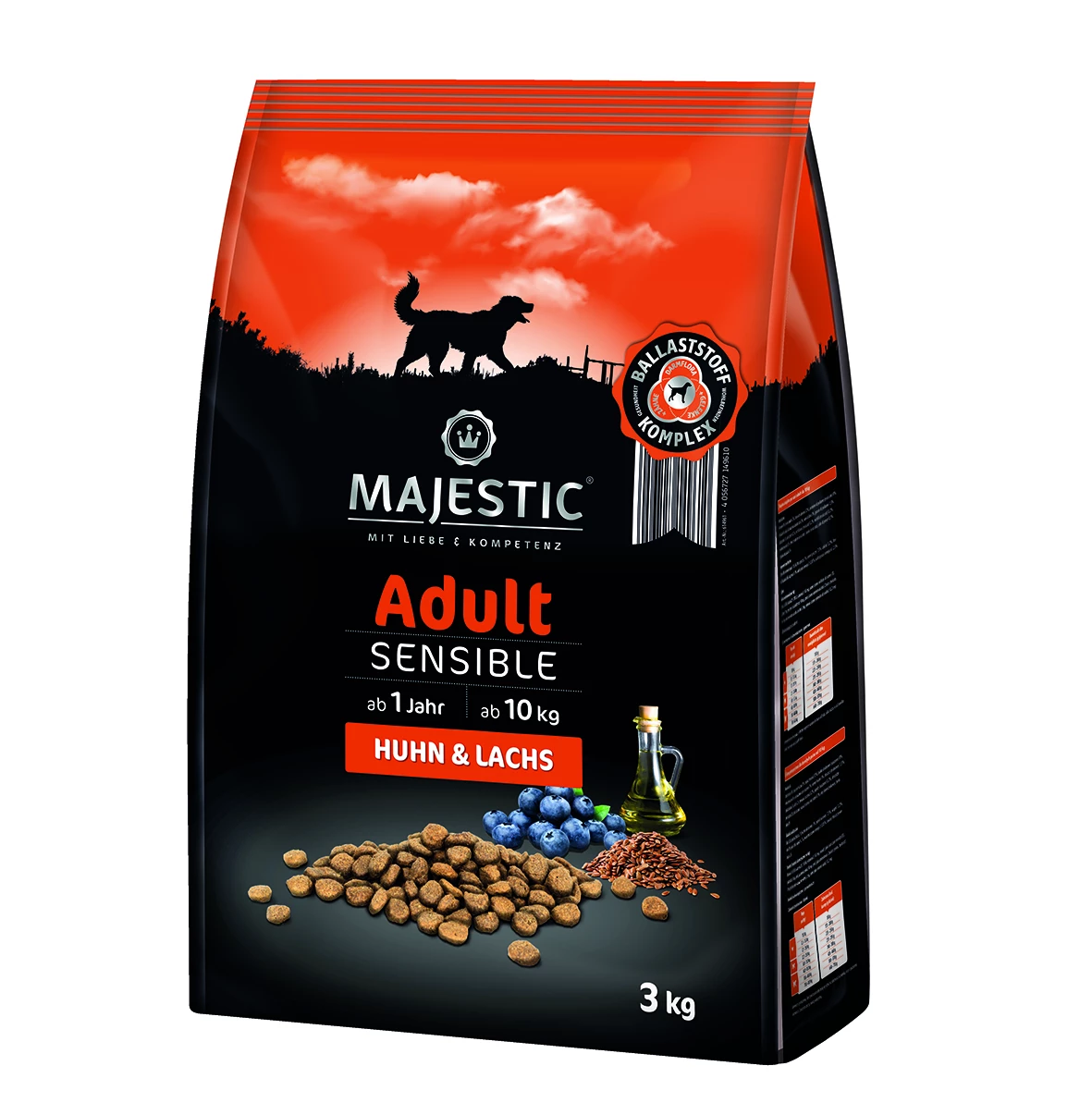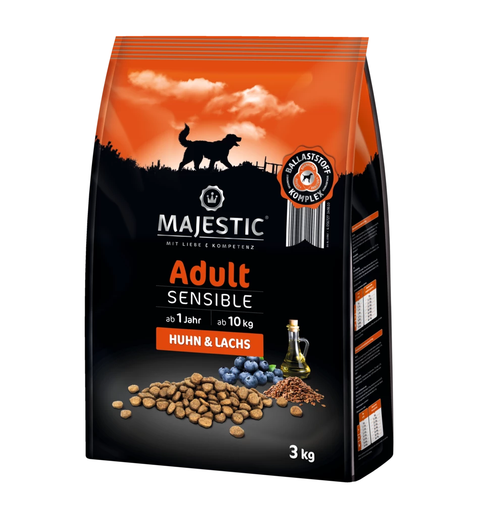MAJESTIC garantiert wohlschmeckende Mahlzeiten und versorgt auch Ihren sensiblen Hund sicher mit allen wertvollen Nähr- und Wirkstoffen – für eine moderne Ernährung. Die Rezeptur aller MAJESTIC-Produkte ist ohne Zusatz von Zucker, Soja, Weizen und Mais sowie gentechnisch veränderten Zutaten. Sie ist leicht verdaulich und komplett ohne Zusatz von Getreide und Gluten. Durch den MAJESTIC-Ballaststoff-Komplex kann zu einer gezielten Verdauungsregulierung und zur langfristigen Optimierung der Darmflora Ihres Hundes beigetragen werden.