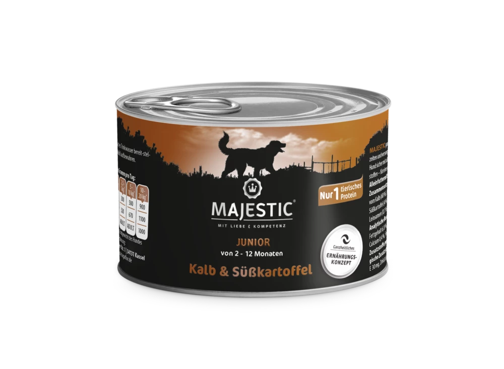 MAJESTIC Nassfutter für wachsene Hunde ist eine vollwertige Hauptmahlzeit mit wertvollen Proteinquellen. Nur eine tierische Proteinquelle: Kalb (Monoprotein). Bei der Entwicklung unseres ganzheitlichen Ernährungskonzeptes für Hunde haben wir besonders viel Wert auf folgende 3 Punkte gelegt: