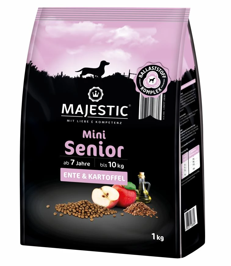 Alleinfuttermittel für ausgewachsene, ältere Hunde ab 7 Jahre kleinerer Hunderassen (bis 10kg Körpergewicht). Glutenfreies Hundefutter mit leckerer Ente und Kartoffel in der 1kg Packung, auch ideal zum Testen.
