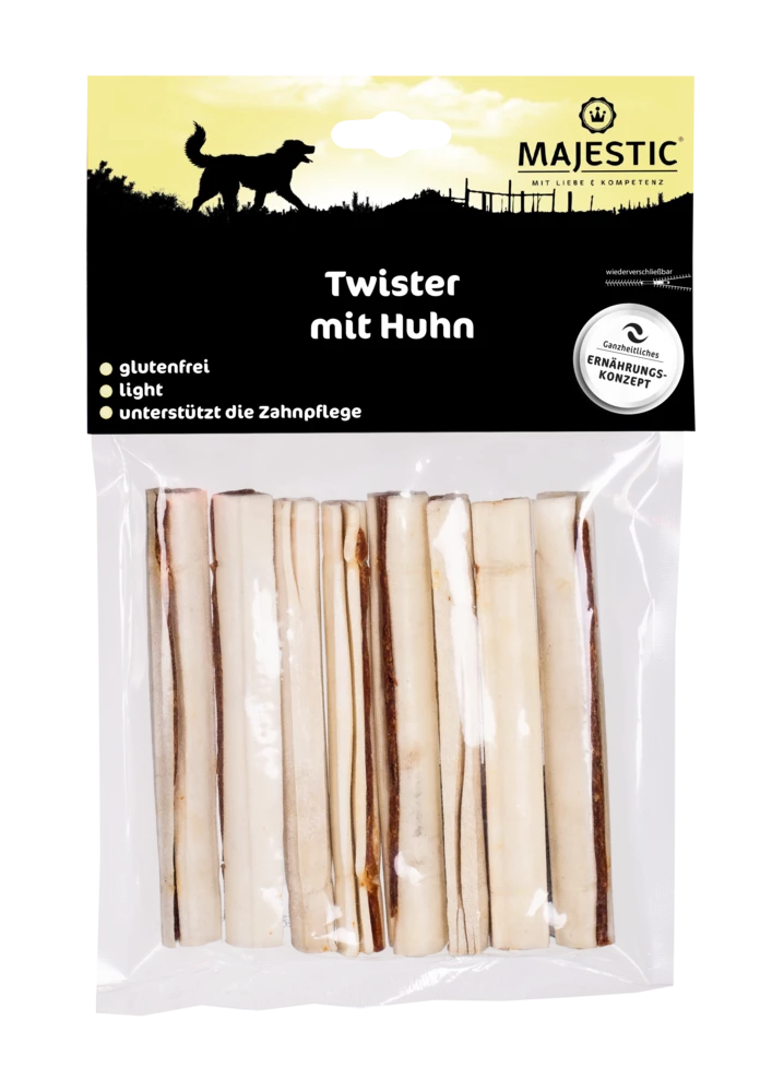 Diese köstliche Mischung aus Rinderhaut und Huhn ist schonend ofengetrocknet und frei von künstlichen Zusatzstoffen. Sie bringt Abwechslung in den Napf für Hunde, die bewusst ernährt werden. Wir empfehlen hier unser ganzheitliches MAJESTIC®- Ernährungskonzept. Hierbei sind Trocken- und Nassnahrung sowie Snacks aufeinander abgestimmt – für eine bessere Bekömmlichkeit. Besonders geeignet für sensible Hunde und Tiere mit Allergien und Futtermittelunverträglichkeiten.