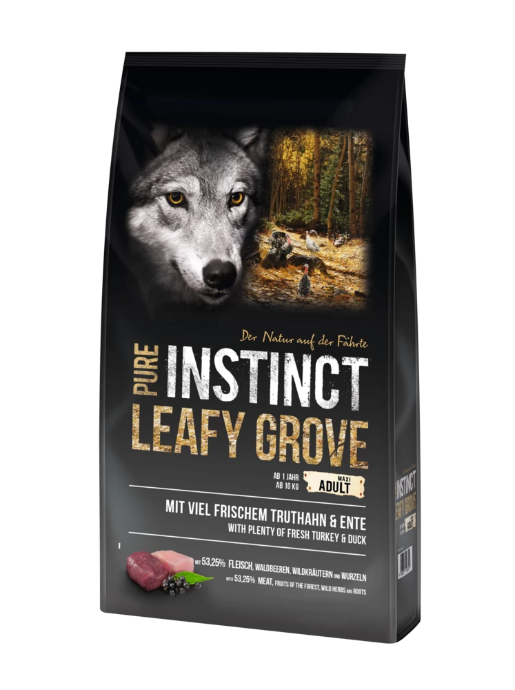 PURE INSTINCT Leafy Grove (Maxi Adult) besteht aus der Varietät Truthahn und Ente und ist ideal für Hunde ab 1 Jahr / ab 25 kg geeignet. PURE INSTINCT setzt auf eine ursprüngliche Ernährung mit der Unterstützung von Waldbeeren, Wildkräutern und Wurzeln, um den Ansprüchen einer ursprünglichen Fütterung gerecht zu werden.