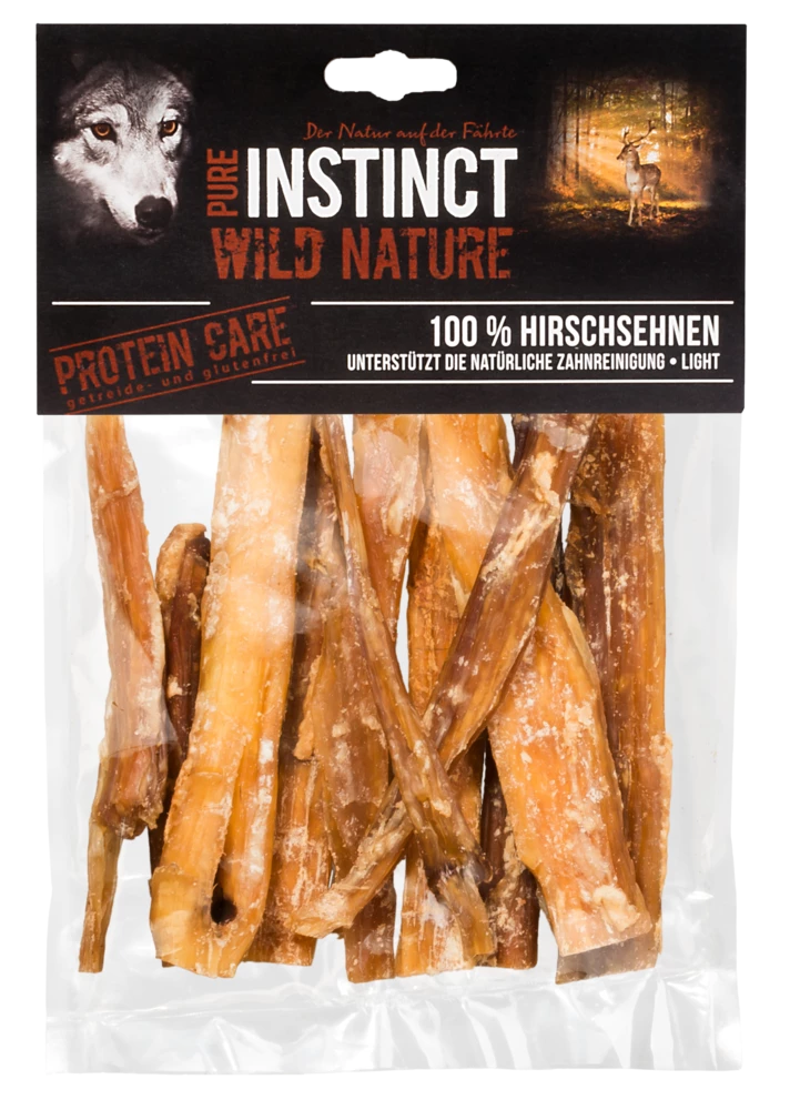 Die PURE INSTINCT Hirschsehnen sind naturbelassene Hundesnacks, wurden schonend verarbeitet und sind auch für empfindliche Hunde und Tiere mit Allergien und Futtermittelunverträglichkeiten gut geeignet. Hirschsehnen unterstützen die natürliche Reinigung der Zähne und bieten langes Kauvergnügen.