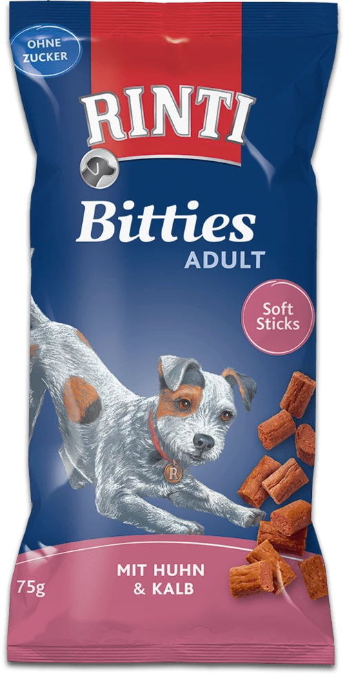 Mit viel frischem Fleisch zubereitet. Die extra weichen Stückchen – wie alle Rinti Snacks ohne Zucker – lassen sich besonders gut zerbeißen.