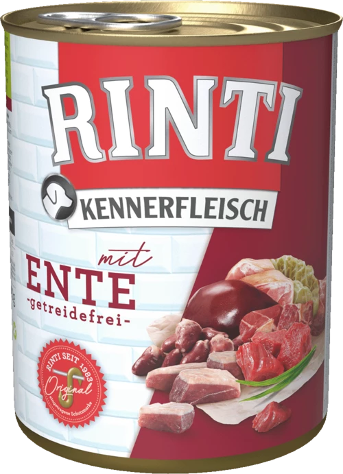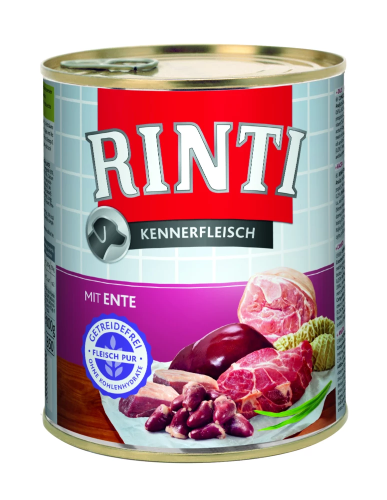 Getreidefreies Alleinfuttermittel für ausgewachsene Hunde von RINTI. Lecker Ente in der praktischen 800g Ringpull-Dose. Keine Kohlenhydrate enthalten!
