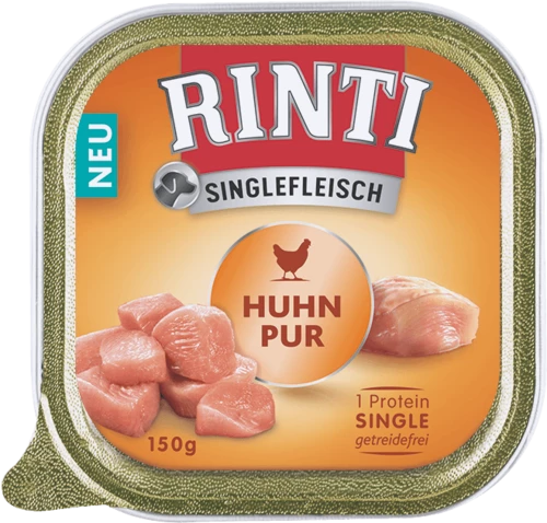 Rinti Singlefleisch für eine ausgewogene, proteinreiche Ernährung ohne zugesetzte Kohlenhydrate und getreidefrei, mit nur einer Proteinquelle und damit besonders gut geeignet bei Futtermittelallergien und Unverträglichkeiten. Dadurch, dass in jeder Sorte ausschließlich eine einzige Tierart verwendet wird, ist eine besonders abwechslungsreiche Ernährung über alle Sorten gewährleistet. Rinti Singlefleisch ausschließlich mit 100% HUHN PUR im Fleischanteil. Auch für sensible Hunde.
