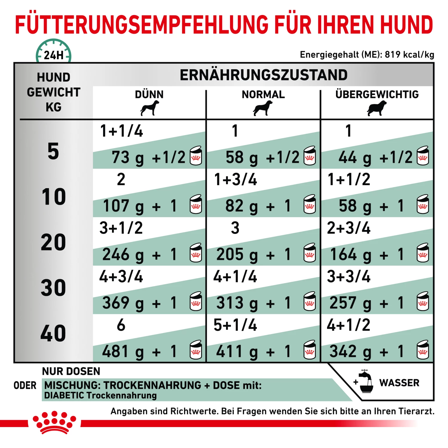 Bei diesem Produkt handelt es sich um eine tierärztliche Nahrung aus dem Sortiment Veterinary Health Nutrition von ROYAL CANIN®. Dementsprechend ist es wichtig, dass das Futter nur auf Empfehlung einer Tierärztin oder eines Tierarztes gefüttert wird. So kann sichergestellt werden, dass Ihr Tier genau die Nahrung erhält, die es wirklich benötigt. Eine Nahrungsumstellung sollte sorgfältig und schrittweise über einen Zeitraum von 7–10 Tagen erfolgen. Achten Sie auf die korrekte Portionsgröße – insbesondere bei Mischfütterung.