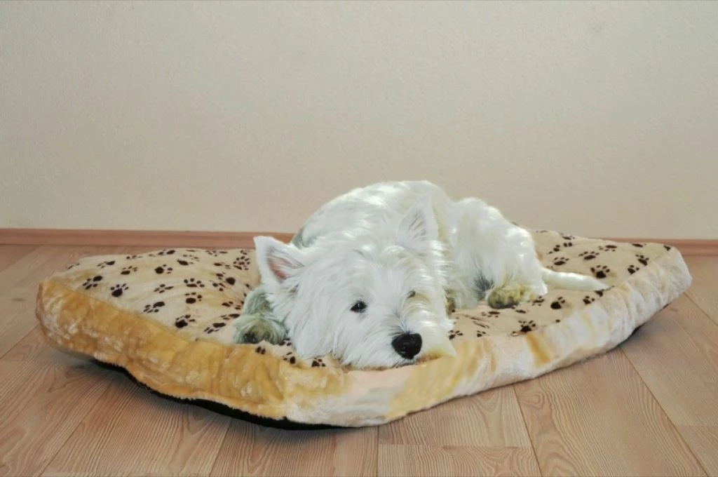 Weiches und gemütliches Liegekissen für Hunde mit hochwertigem Jaquard-Plüsch in Beige mit Pfotenmotiv in Braun. Bezug verfügt über einen Reißverschluss, ist somit abnehmbar und Waschbar. Maße ca. 75x42x8cm
