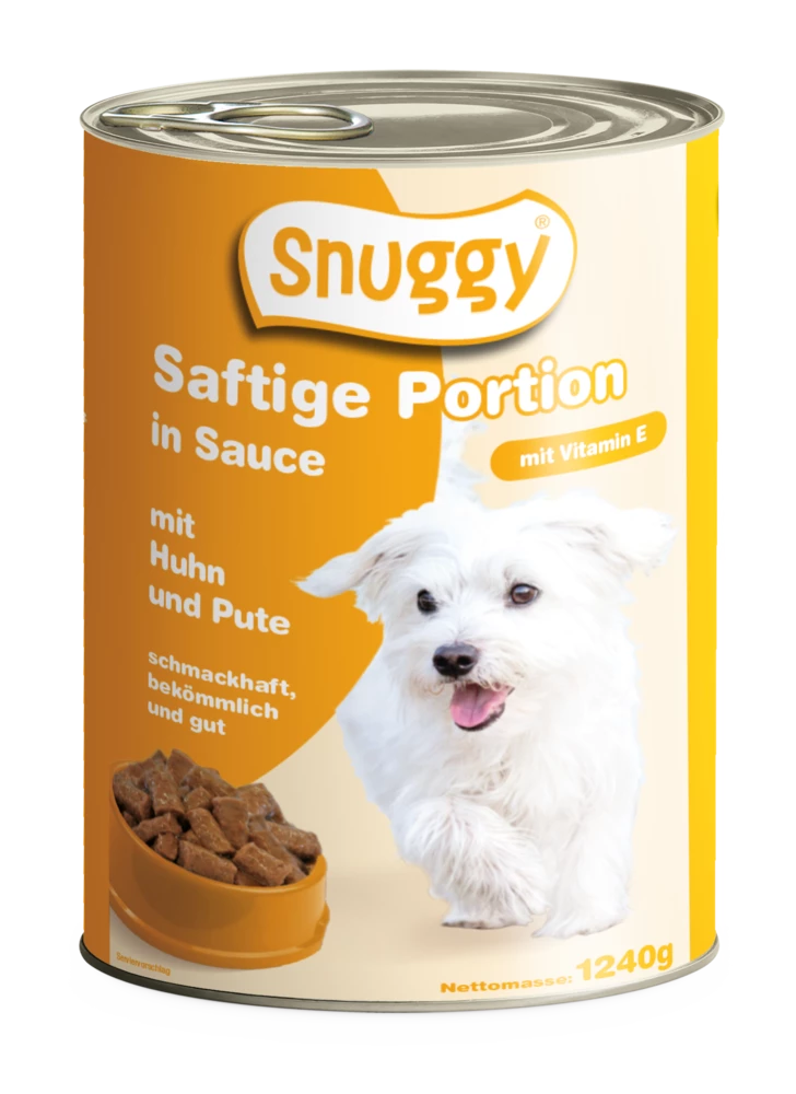 snuggy Saftige Portion in Sauce ist eine besonders schmackhafte, bekömmliche und hochverdauliche Vollnahrung für alle Hunde. Alleinfuttermittel für ausgewachsene Hunde.