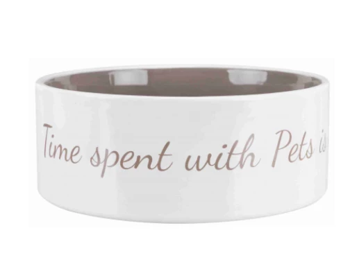 Keramiknapf mit einem Fassungsvermögen von 800ml sowie einem Herz als Motiv am Boden des Napfes. Mit Aufschrift: „Time spent with pets is never wasted.“ Übersetzung: „Zeit, die man mit Tieren verbringt ist niemals verschwendet. Der Napf für alle Tierliebhaber.
